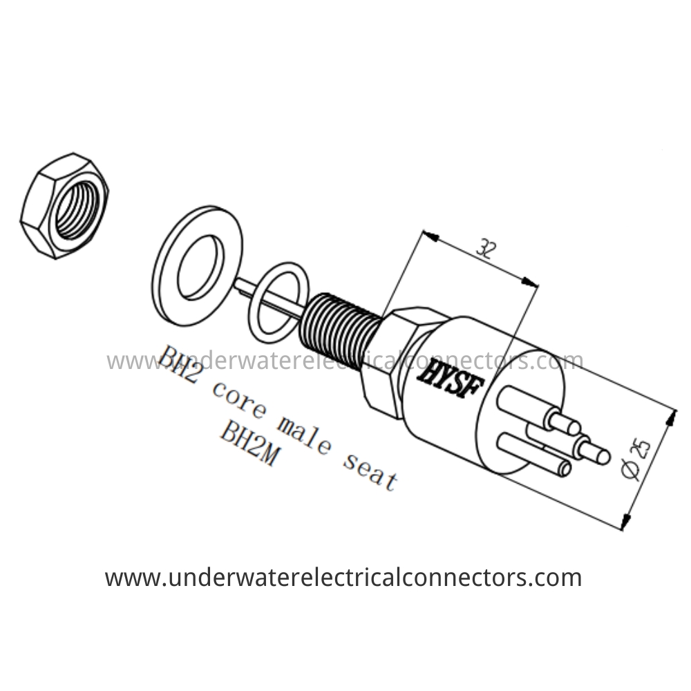 HYSF BH2M is a durable 2-pin male bulkhead underwater connector with M14×1 thread and 32 mm behind-panel length. Rated for 7000 m (70 MPa), widely used in ROVs, subsea enclosures, underwater lighting systems and deep-ocean instrumentation.