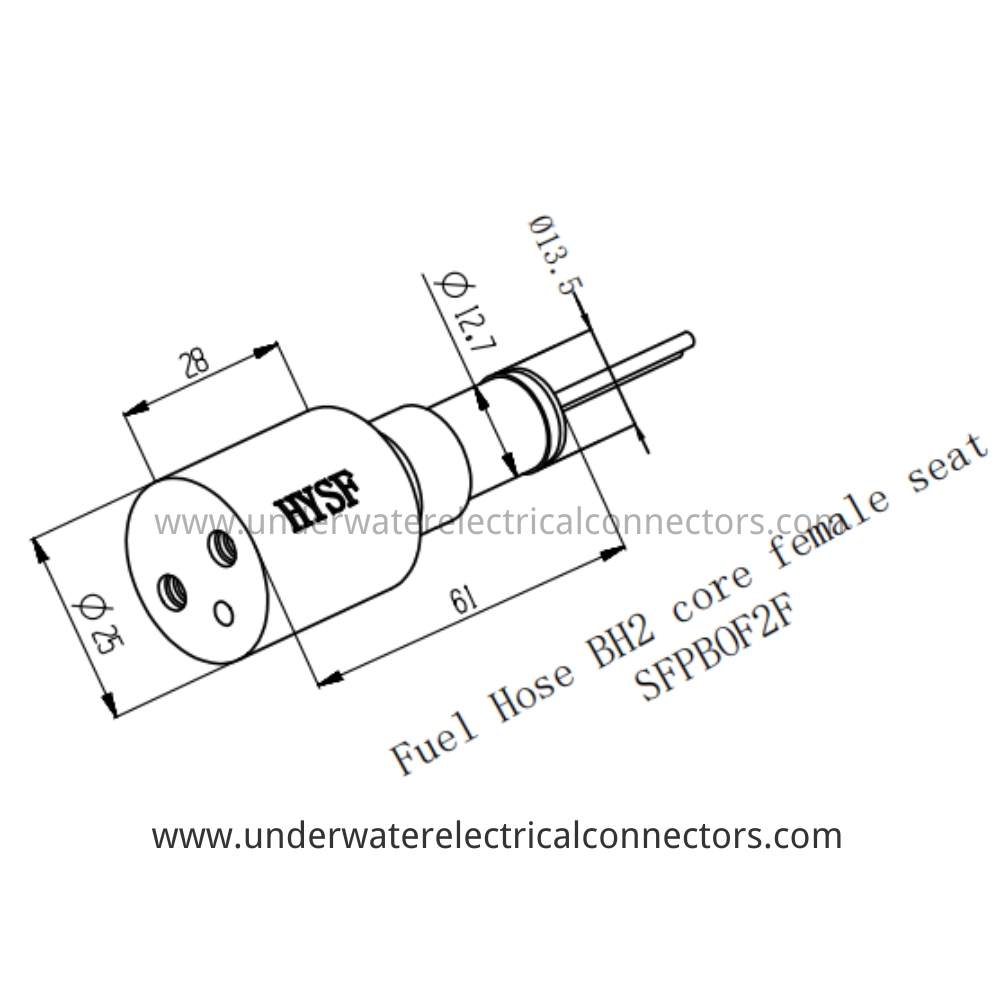HYSF SFPBOF2F is a specialized 2-pin female bulkhead connector with integrated fuel/oil hose barb (Ø6 mm). Designed for direct connection of flexible fuel lines on underwater vehicles, ROVs, and subsea hydraulic systems. Full ocean depth 7000 m rated.